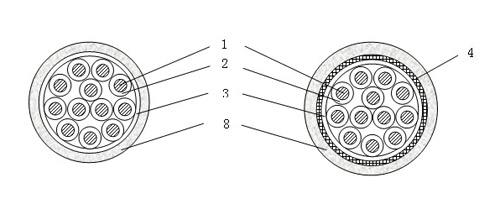 5--- 銅帶屏蔽; 6--- 內護層; 7--- 鋼帶鎧裝; 8--- 聚烯烴護套。